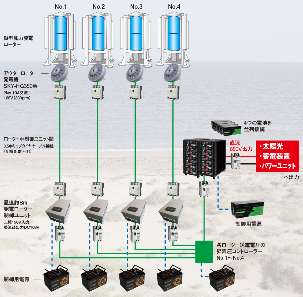 風力発電制御装置は20Vから起動開始し最大270V出力しますがリミッターにて定格168Vに抑えミキシング装置にて4基の送電を集約し680V出力します。